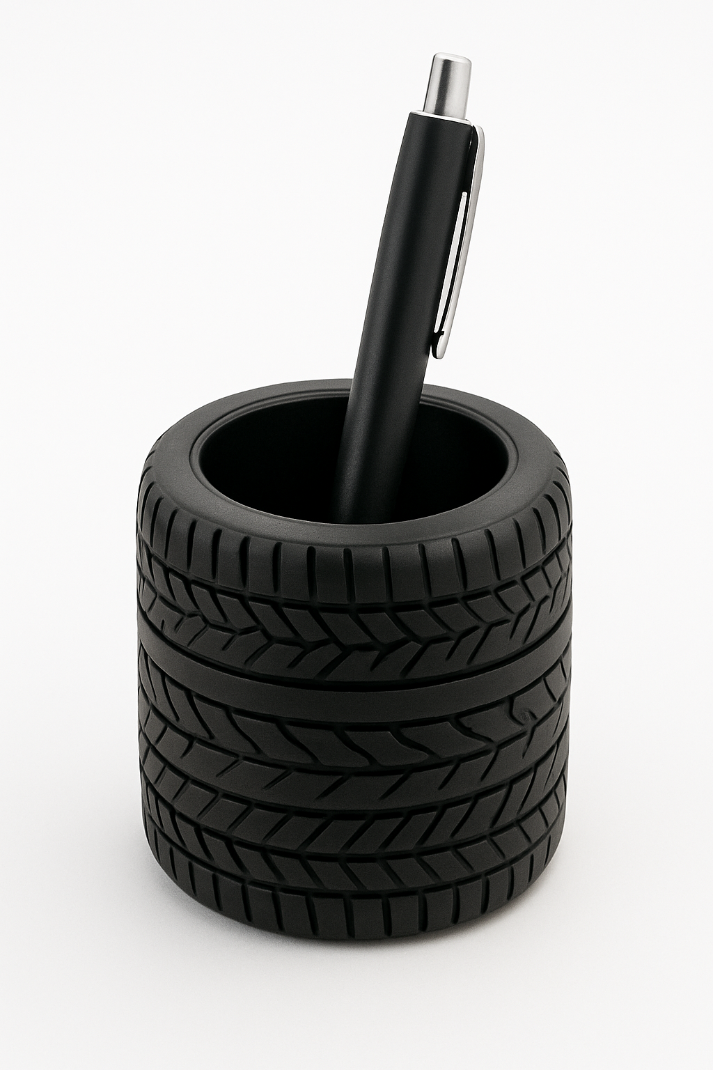 Features: A rugged, 3D printed pen stand designed with realistic tyre tread texture.