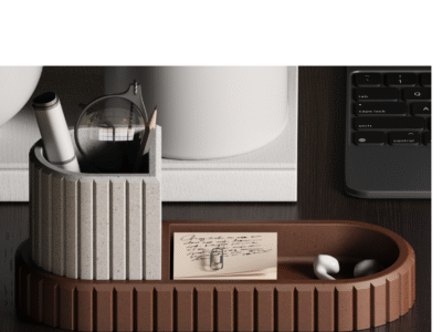 Features: Modular 3D-printed desk organizer with customizable compartments for pens, cards, and accessories.