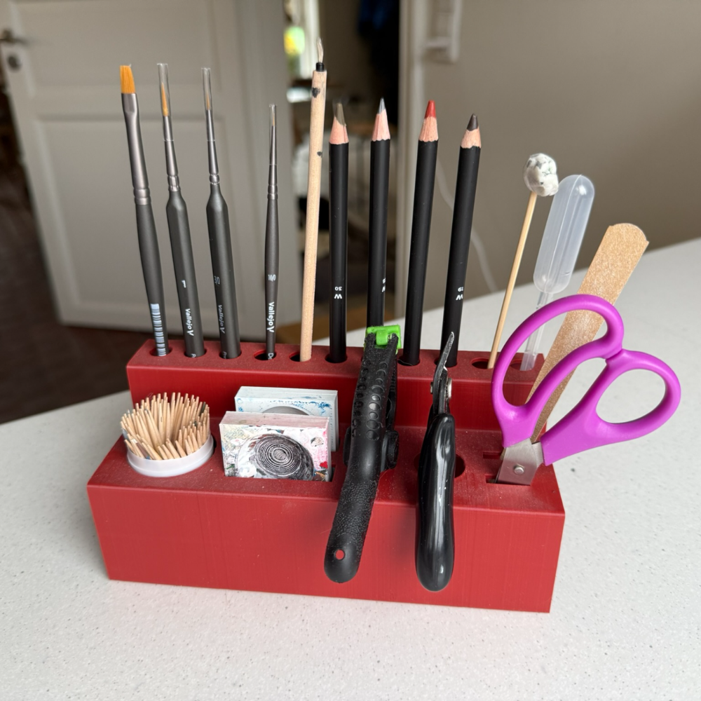 A 3D printed modeling and miniature painting tool organizer designed for artists, hobbyists, scale model makers, and tabletop gaming enthusiasts. Perfect for organizing brushes, paints, cutters, files, and precision tools on your work desk.