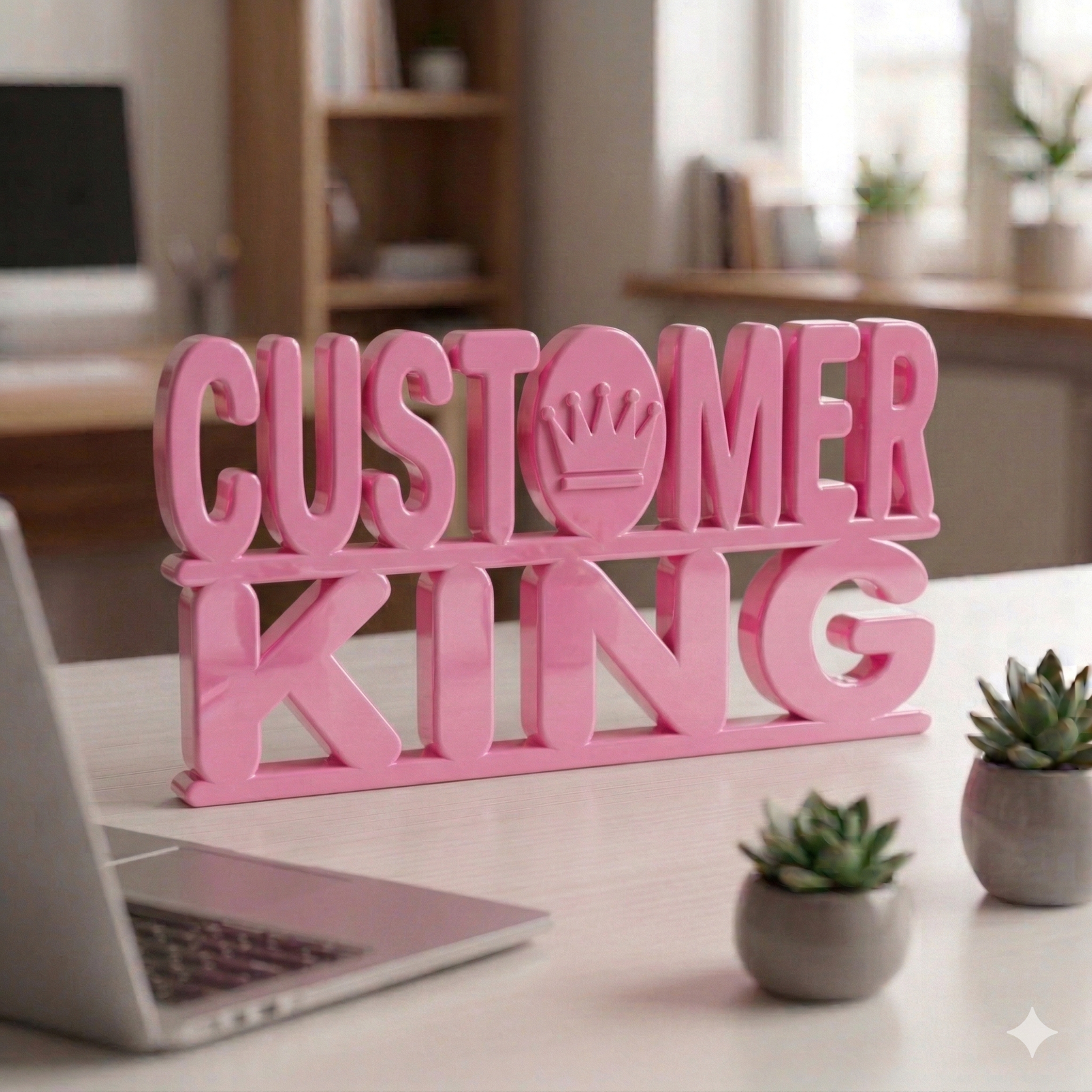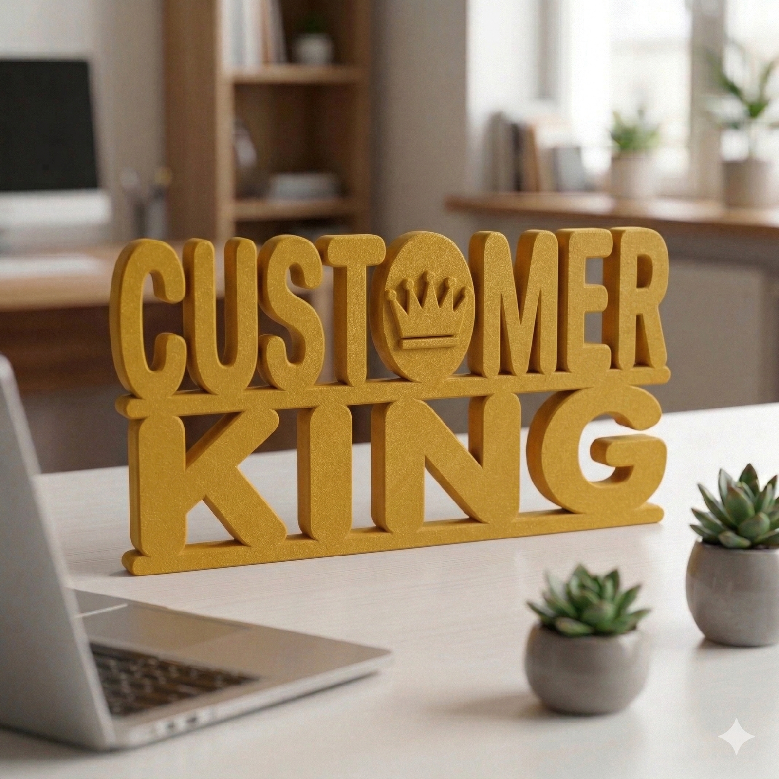 This 3D printed desk sign is perfect for office desks, sales counters, customer service departments, reception tables and business workspaces. It reminds teams to stay focused on customer satisfaction and maintain a strong work ethic.