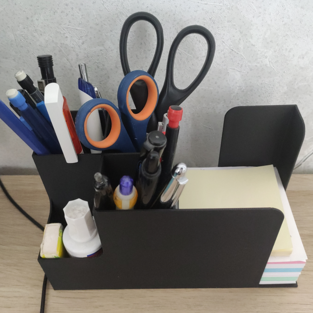 A 3D printed pen and notepad holder designed for organized workspaces. Ideal for office desks, home study tables, schools, colleges, IT offices, factories, reception areas, and daily desk use. Lightweight, durable, and modern in design.