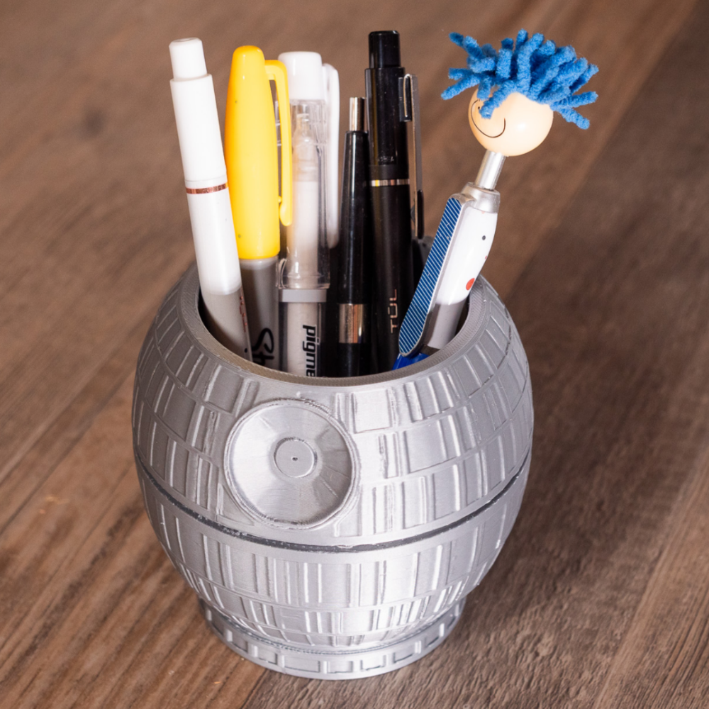 A premium 3D printed Death Star pen holder designed for office desks, workstations and study tables. Perfect as a corporate desk gift, IT office accessory, and professional workspace organizer.