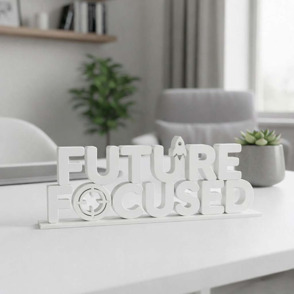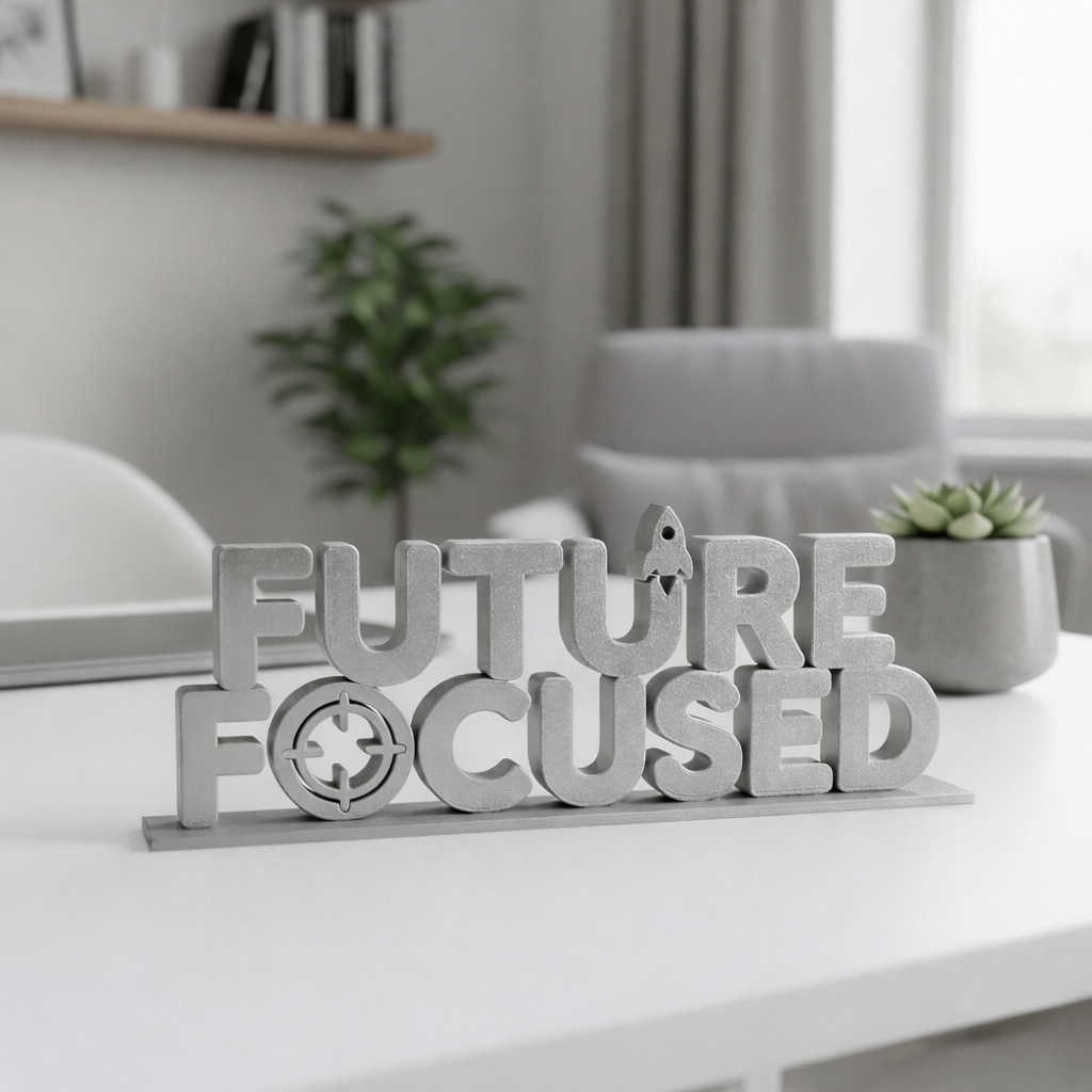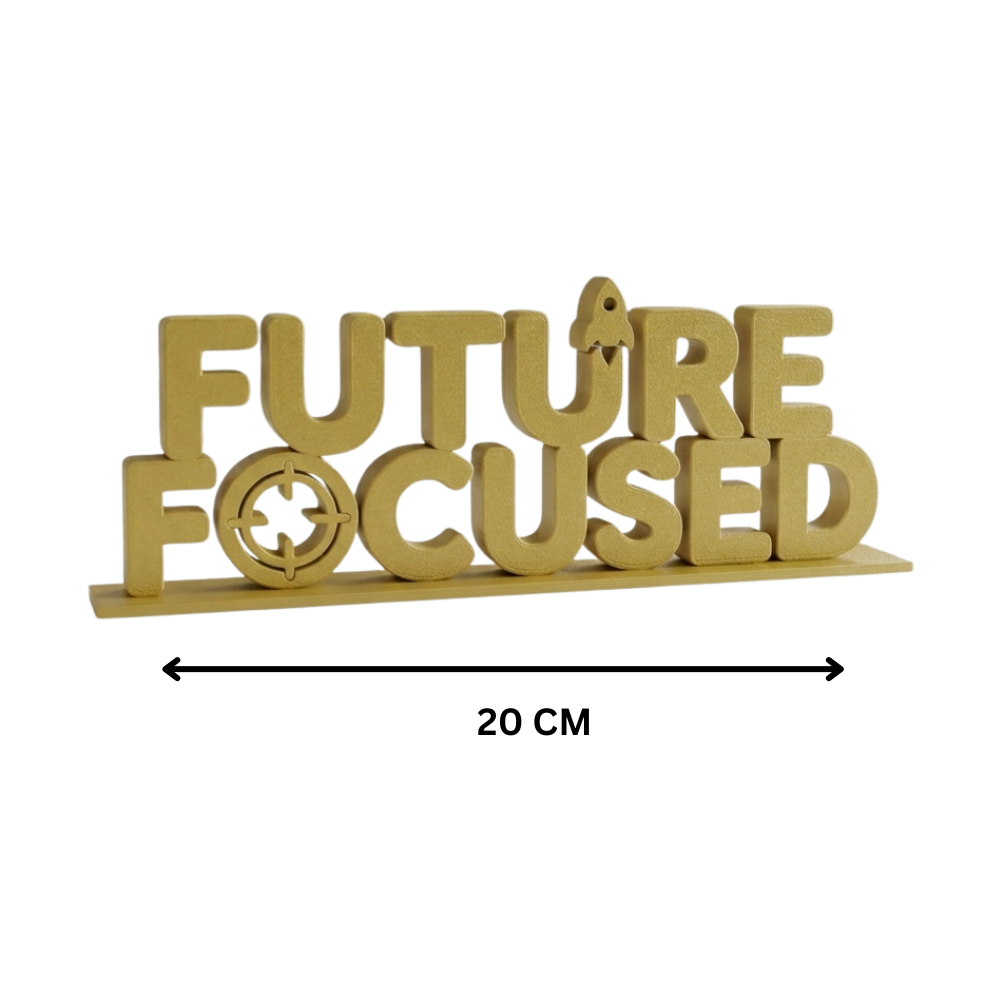 Future Focused is a modern 3D printed motivational desk display specially designed for corporate offices, startups, and IT companies that want to inspire their employees and promote a forward-thinking work culture.