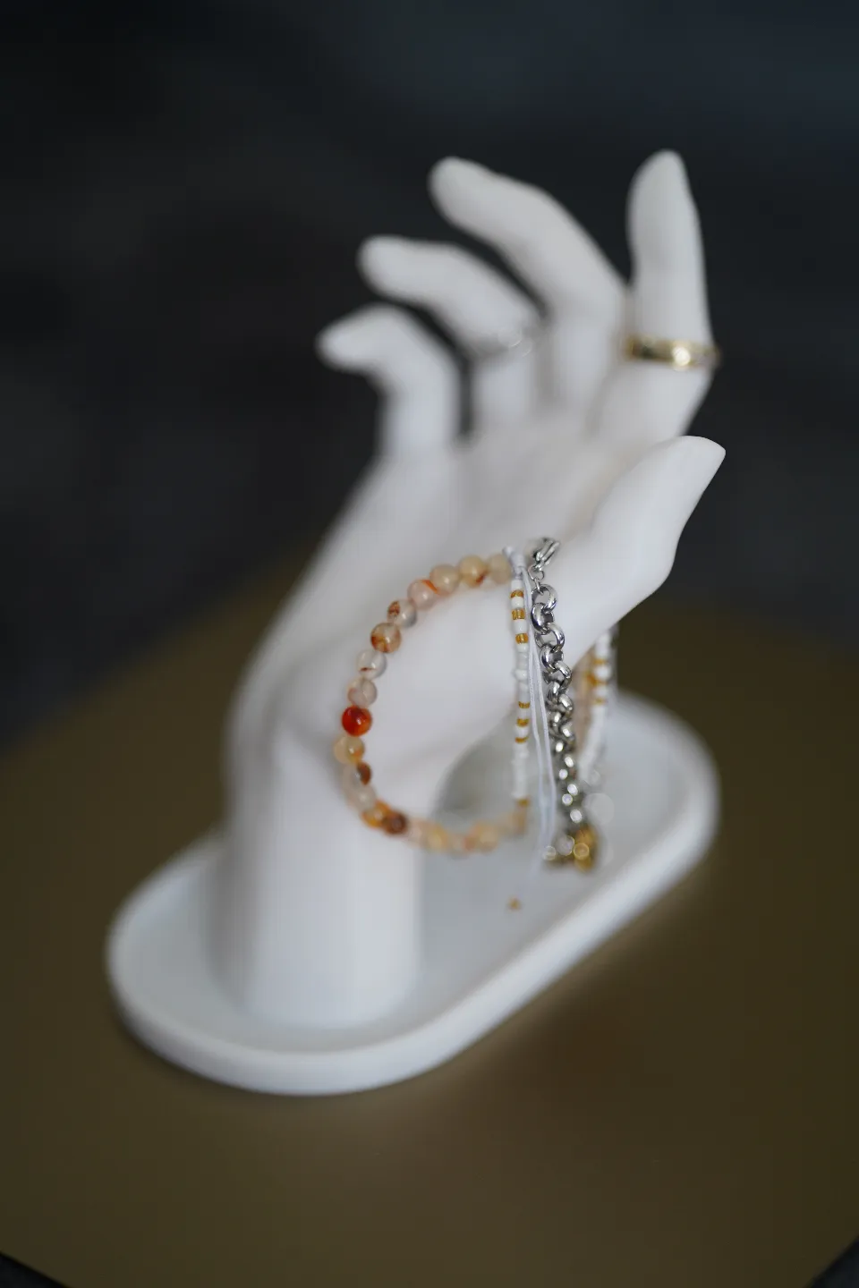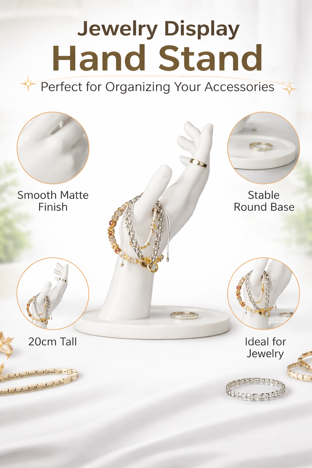 The smooth matte finish gives a premium, soft look that enhances the shine of your jewelry without distraction. Every curve of the hand is crafted to hold accessories naturally, making your collection look more appealing and organized.