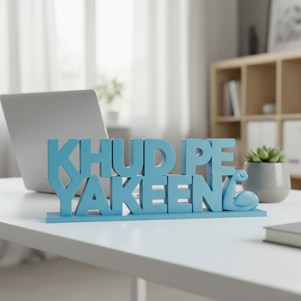 Khup Pe Yakeen is more than just a desk accessory — it’s a message of belief, confidence, and motivation. Carefully 3D printed using high-quality material, this elegant quote showpiece is designed for modern offices, startups, IT companies, manufacturing units, and corporate environments.