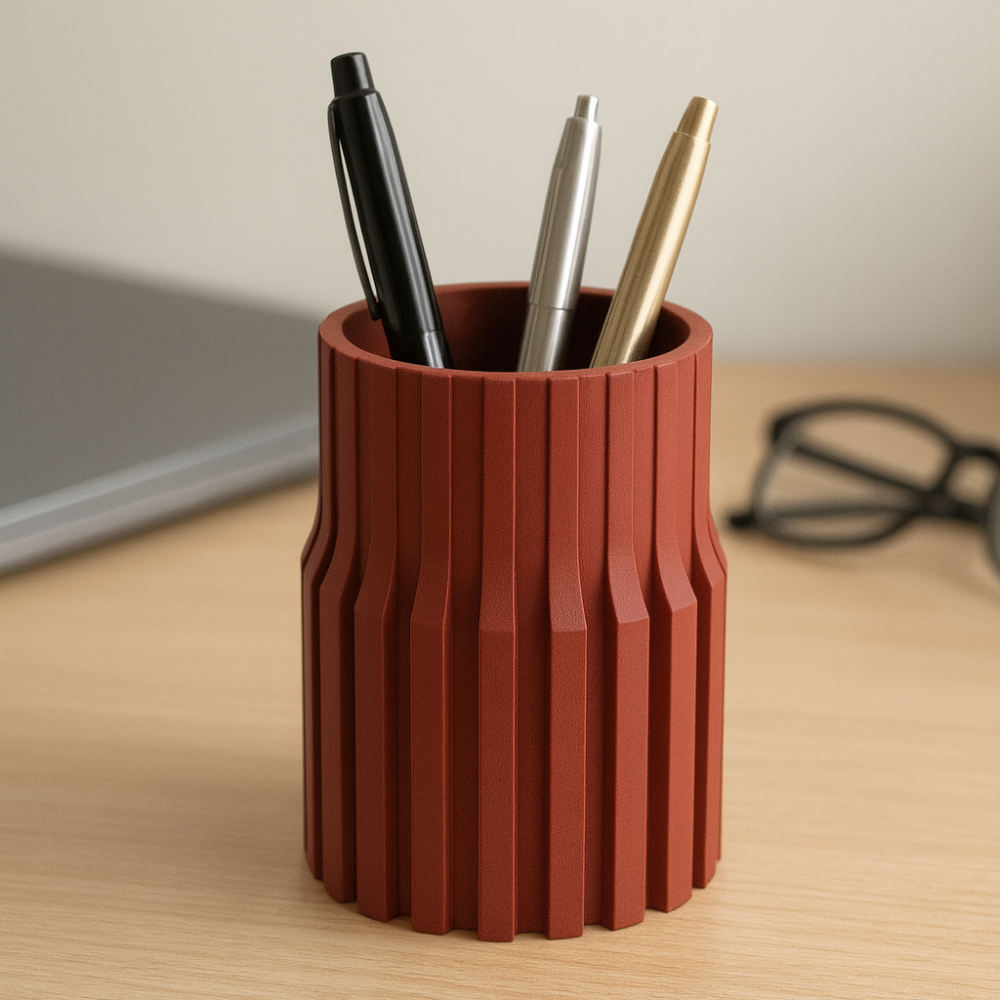 A premium 3D printed modern ribbed pen holder designed for office desks, home offices, study tables and workstations. Perfect for organizing pens, markers and stationery while adding a stylish and professional look to any workspace.