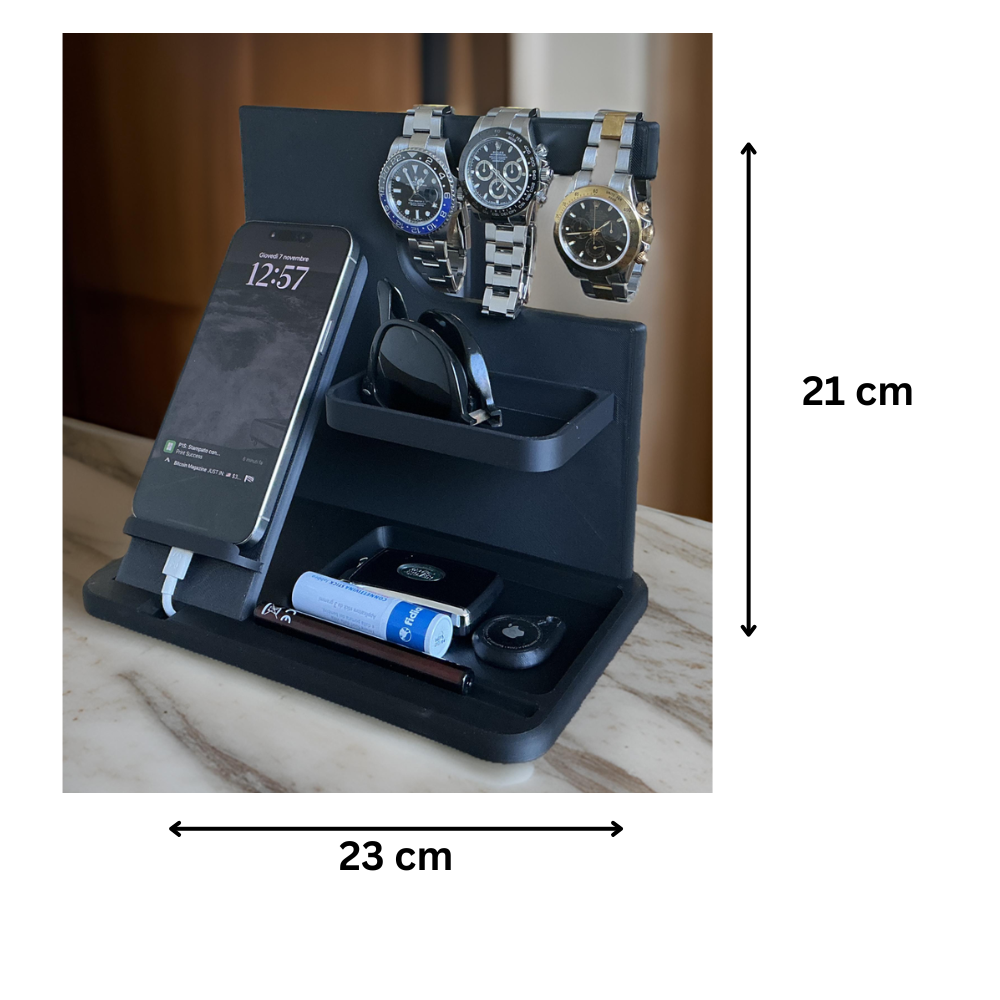 Upgrade your workspace or home setup with this Multi-Brand Docking Station, crafted for people who value organization, convenience, and premium aesthetics. This all-in-one stand comfortably holds your mobile phone, smartwatch, goggles, and car key while keeping your desk clean and clutter-free.