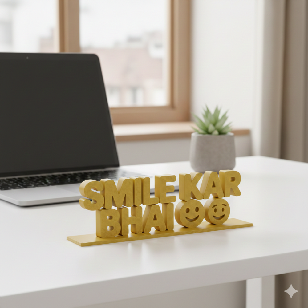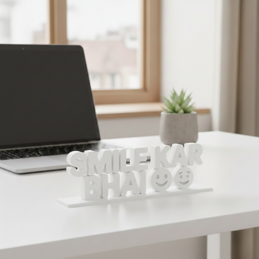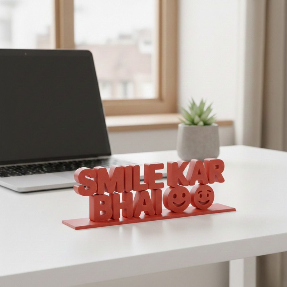 Smile Kar Bhai is a uniquely designed 3D printed desk decor piece that adds motivation, positivity, and a touch of personality to any workspace. Crafted using high-quality 3D printing technology, this lightweight yet durable table showpiece is ideal for modern offices and creative environments.